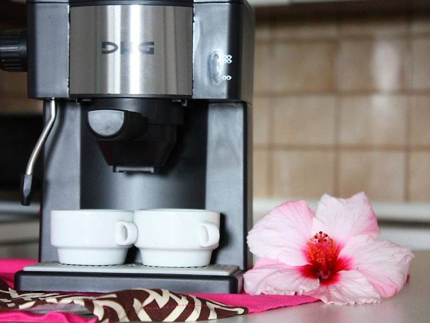 Die Küche der Ferienwohnung in La Paz ist halb offen und wir durch einen Tresen samt Hockern vom Wohnbereich abgetrennt. Sie enthält nicht nur einen großen Kühlschrank mit Gefrierfächern, einen Backofen und ein Ceranfeld mit 4 Kochstellen, sondern auch kleinere Küchengeräte, wie zum Beispiel eine Mikrowelle oder oder eine Kaffeemaschine. Für das leibliche Wohl kann also gesorgt werden.